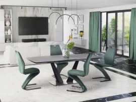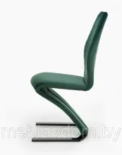 Обеденный стул K442 на одной ножке обит мягкой и приятной на ощупь бархатистой тканью тёмно-зелёного, горчиного или пепельно-серого цвета. Подковообразное основание изготовлено из стали с чёрным порошковым покрытием.